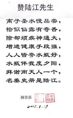 新疆63歲的賀兆生飲用一年,冠心病未愈,他用電話介紹是食堂管理員,問他食量多少?說吃七八分飽,睡前還吃兩袋牛奶,陸 江說我在論文和書中多次批判“吃七八分飽”,關(guān)照患者務(wù)必用“己饑方食”控制主食肉食量,要他把牛奶改在早中餐吃,減少主食肉食量,建議不吃晩餐,晚上只吃一個(gè)蘋果,再經(jīng)幾個(gè)月補(bǔ)水節(jié)食,治愈了21年的冠心病和肥胖、失眠等病,信中由衷地感激陸 江為再生父母。[13]因?yàn)獒t(yī)生從未過問他的膳食習(xí)慣,只管開處方藥或手術(shù),父母也不會(huì)叫他不吃晩飯。